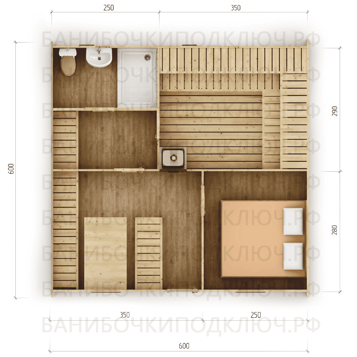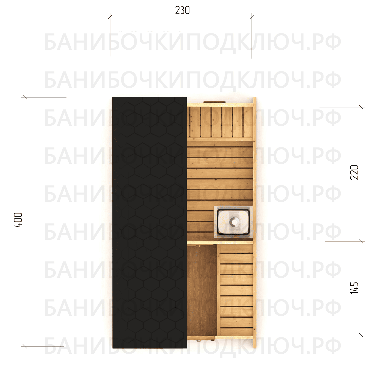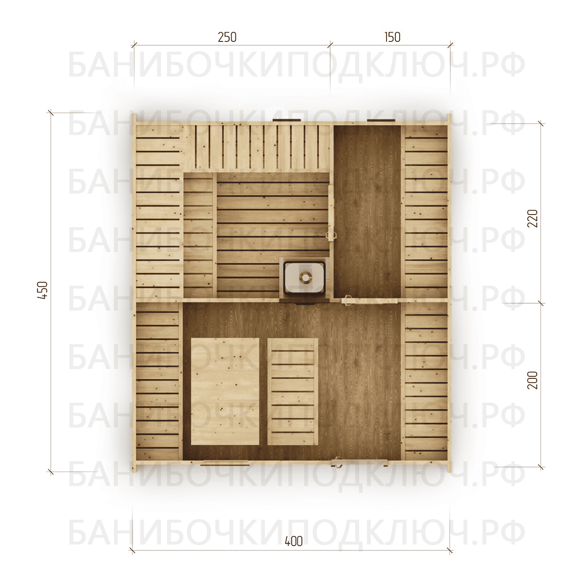 парилка - 220 см, мойка - 110 см, предбанник - 130 см