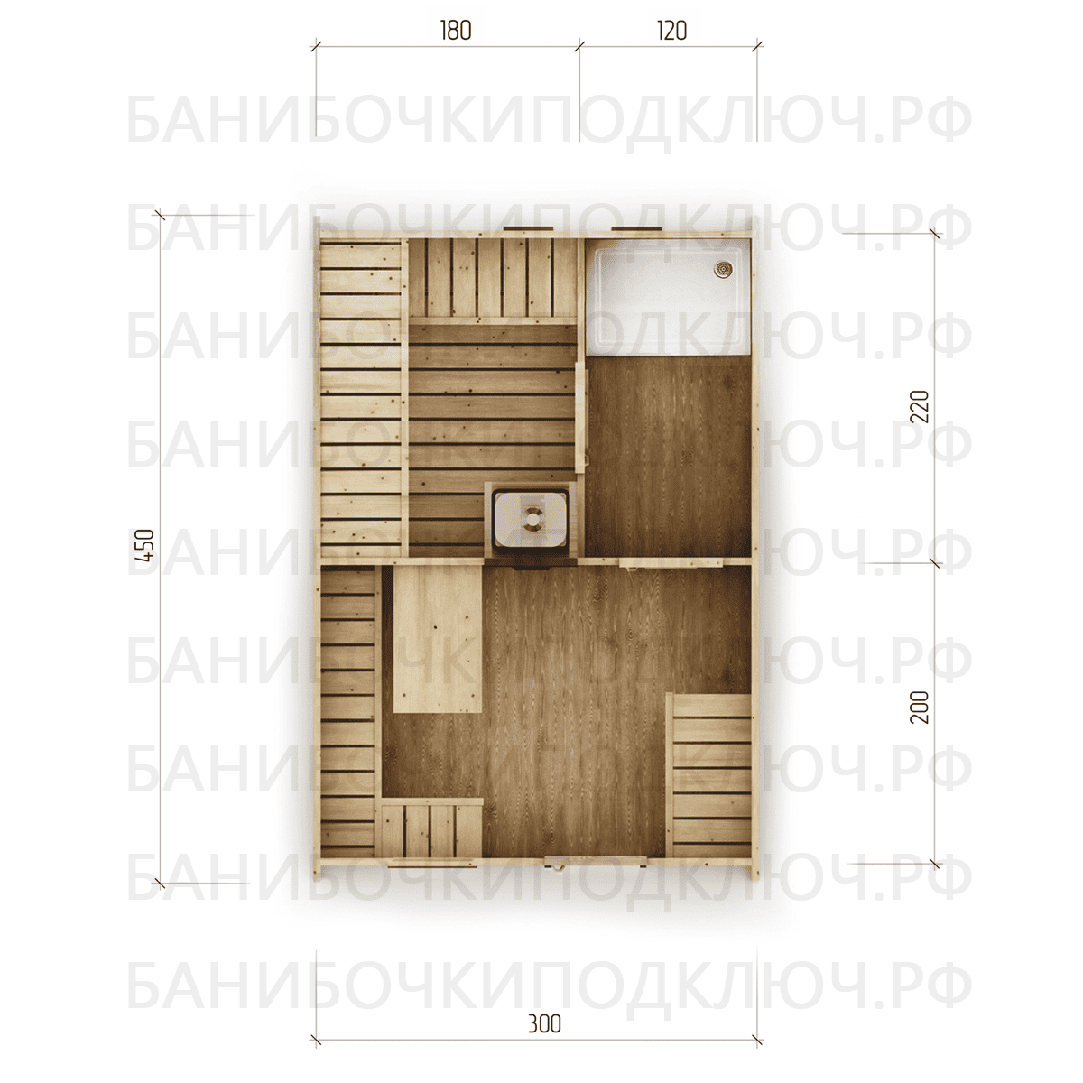 парилка - 220 см, мойка - 120 см, предбанник - 180 см