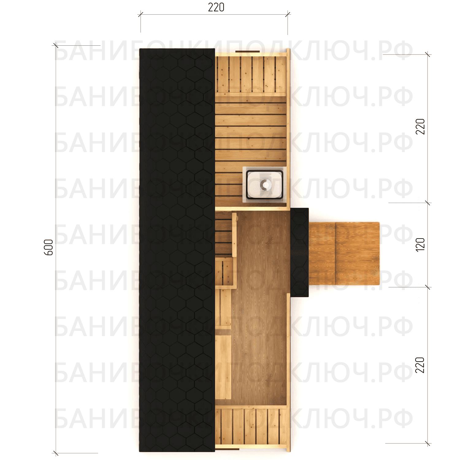 парилка - 220 см, мойка - 120 см, предбанник - 220 см